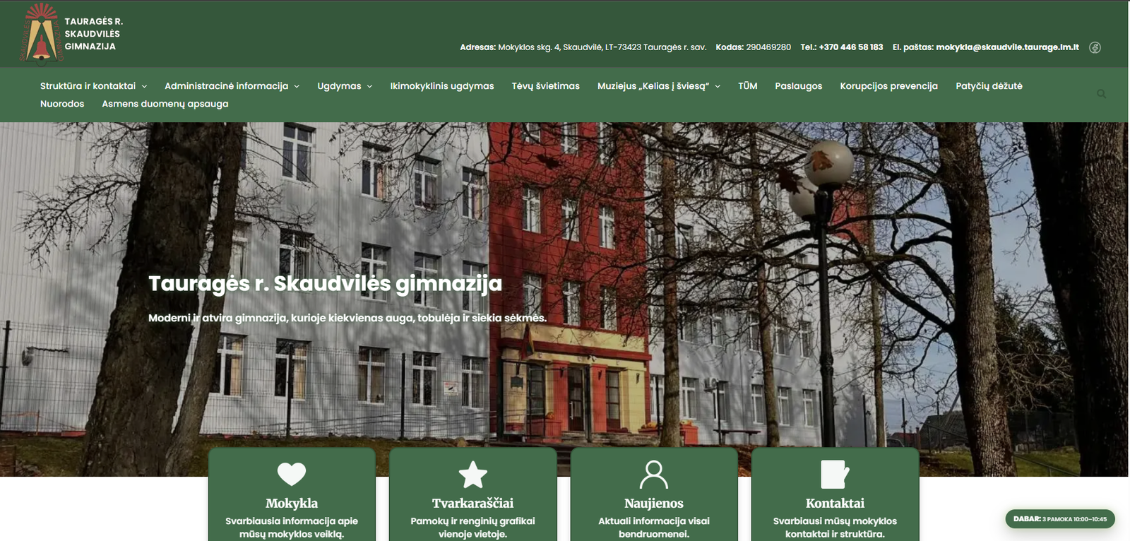 Svetainė su pagrindiniais skyriais: apie mus, paslaugos, kontaktai.